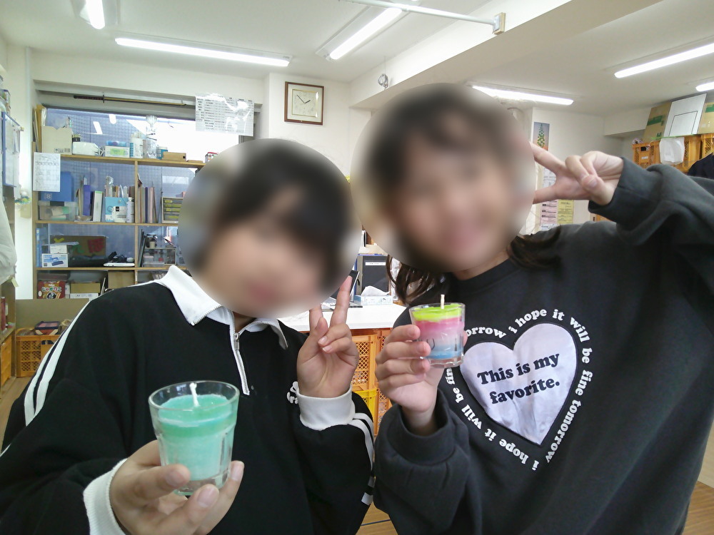 西寺尾とんぼでは毎年12月に入ると、オリジナルロウソク作りを行います。ホットプレートでロウソクを溶かして、そこにクレヨンを入れて色を付けます。その色の付いたロウソクをビンの中に好きな量だけ入れて、世界に一つだけしかないオリジナルロウソクの完成!!